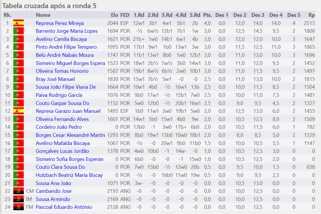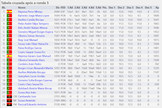 | 1 | NM | Carneiro Carlos Alberto Carva | 2256 | POR | 22w1 | 20b1 | 4w1 | 11b1 | 12w1 | 5b1 | 3w0 | 6.0 | 0.0 | 27.0 | 21.0 |